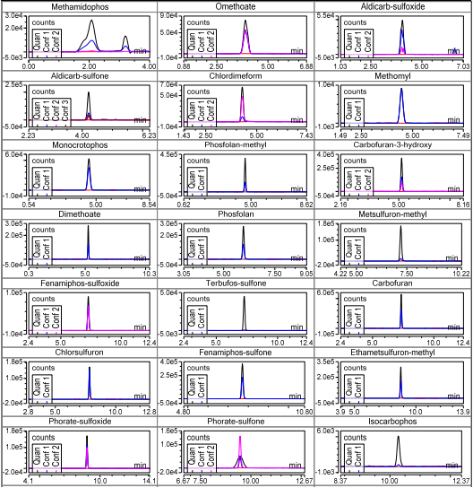 GB23200.121-2021 食品安全国家标准植物源性食品中331种农药及其代谢物残留量的测定液相色谱法-质谱联用法 仪器型号:VanquishTSQQuantis 色谱柱:JADE-PAK®KF-C18100×2.1mm1.8μm(PN:8617-1021) 保护柱:UPLC通用型保护柱套装(RP)(PN:G2030-K11) 流动相:A:甲酸铵-甲酸水溶液; B:甲酸铵-甲酸甲醇溶液;梯度洗脱; 流速:0.30mL/min 柱温:40℃ 进样量:2μL 质谱参数 电离模式:ESI;喷雾电压:3500V; 质谱扫描方式:MRM;离子传输管温度:330℃; 离子源温度:300℃;鞘气压力:35arb;辅助气压力:10arb;
